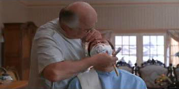 Хочу продолжить тему еще одним фильмом, с участием Джима Керри... Картина называется "Тупой и еще тупее", вышла также в 1994 году. Фильм повествует о двух друзьях - неудачниках, оставивших детство позади, но не избавившихся от детских привычек. Очень веселый фильм. По традиции несколько кадров с опасной бритвой. Кстати на плече у Джима Керри в этой сцене лежит полотенце, мастер вытирает бритву об это полотенце... Заклинания и молитвы работают только у тех, кто живет лицензионную версию жизни. (с) BOR