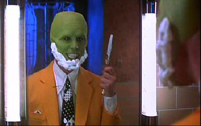 Разбирая свою видеотеку случайно наткнулся на сборник фильмов, в которых играл отличный комедийный актер Джим Керри. Среди прочих на этом диске присутствовал художественный фильм 1994 года выпуска - Маска. Подумал - "а почему бы не посмотреть? классика всетаки..." И каким же было мое удивление, что персонаж Джима Керри (тот самый зелёноголовый лысый тип с широкой улыбкой) тоже пользуется опасной бритвой... Привожу несколько кадров из фильма, но прошу меня извинить - качество оставляет желать лучшего... Пиратская версия