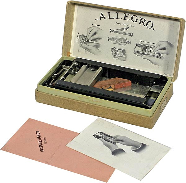 "Устройство для заточки лезвий - технический курьёз, малопонятный в наше время, когда лезвий уже в продаже нет, а бритвенные станки одноразовые. В те времена лезвия были тоже одноразовые, но их можно было затачивать. Советский прибор имел три поверхности для окончательной доводки лезвия, включая кожаную поверхность. Германский карманный прибор имел два вращающихся полуцилиндра, несущих полировальную пасту. Так же существовали карболитовые коробочки для лезвий, полировальные поверхности приводились в движение при помощи крепких шнуров, по которым ездила коробочка."
