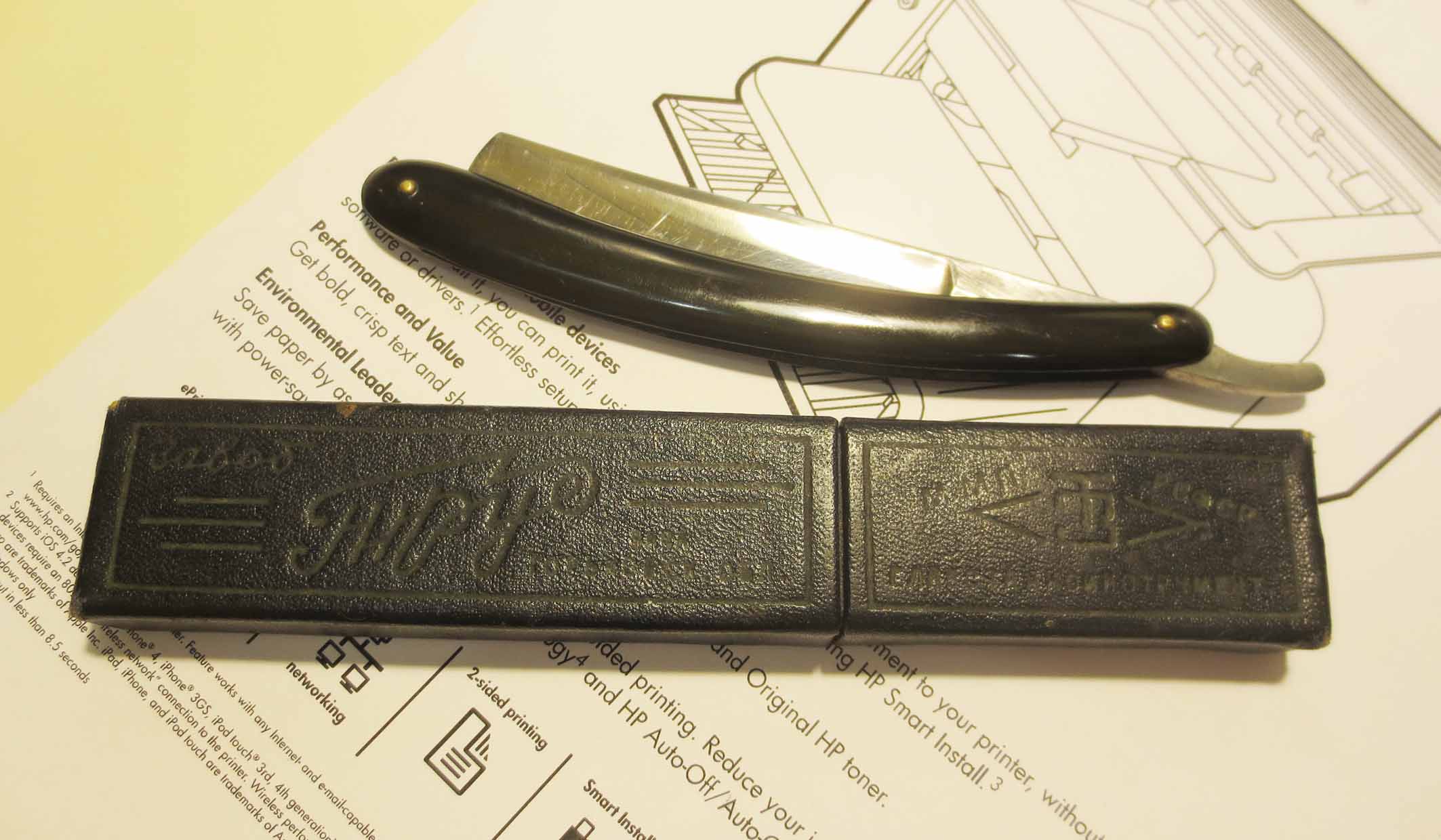 Принес знакомый почти новую оправу с заржавевшим клинком опасной бритвы , уточенным и с улыбкой. Долго думал...выкинуть или нет. Решил попробовать что получиться. Ручка так и осталась как новая  ,а на эрле появилась неполная надпись Волга , ЗТВ 64 г.в.. Точил долго, пока не вывел геометрию...довел....любопытно стало.....  а как она бреет по сравнению с иностранками. Не утерпел и сразу пошёл бриться. Обрился и стою в шоке.  Бритва (то , что от нее осталось) бреет супер. Мягко и чисто. Просто красавица. Буду пользовать на равне с именитостями.
