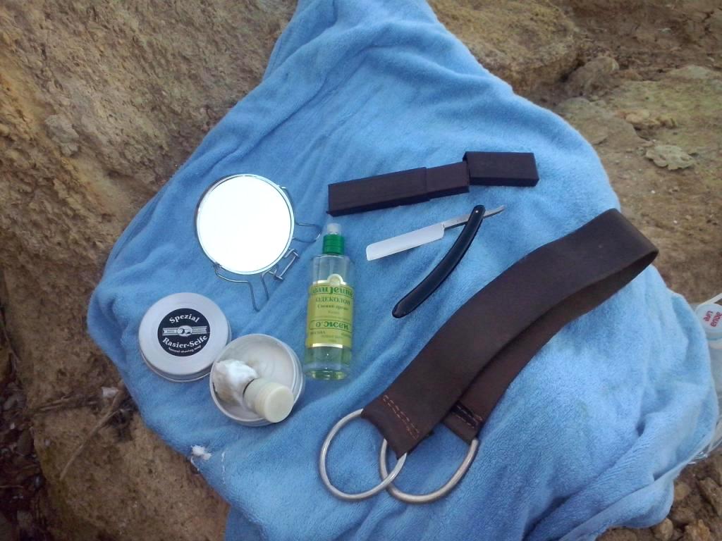 Бритва - англицкий клин B.J.Eyre & Co. Гель до и бальзам после - ГЭСЭР. Помазок - кабан в мраморе. Чаши нет, ибо гель газированный. 32 года активно мусолю харю клинковой бритвой
