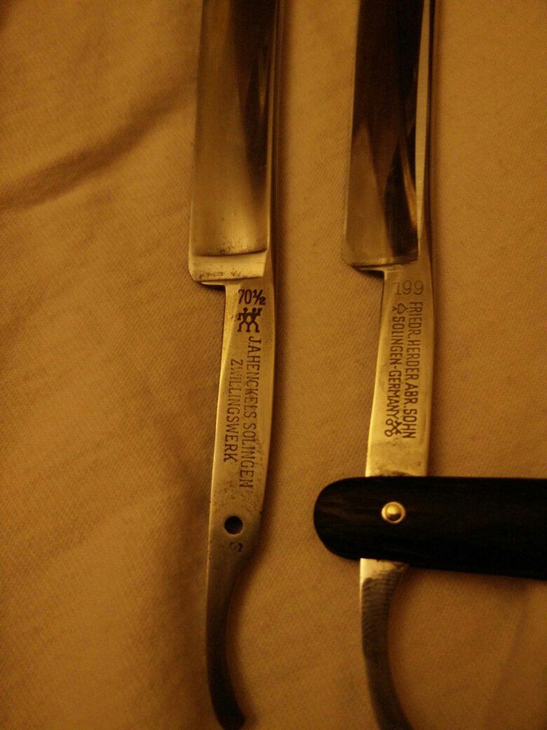 YOUTUBE Олег Бритва INSTAGRAM Олег Бритва Re: Ржа, туды её в качель...при желании можно это делать точечно при помощи тампончика с ватой,смоченной в электролите. почти так же,как при травлении,но с другой полярностью,естественно.Я так товарищу восстанавливал Спартак бритву дедовскую.Там спинка была вся изгрызана и все полотно было рыжее (бритва пролежала в сарае очень много лет).В итоге, конечно,остались каверны от ржавчины, но они стали чистыми. использовал малый ток от аккумулятора автомобильного. Нашел фото,прикрепил. Как метод предложил,вдруг кто не знает.мне этот метод показался наиболее бережным,если есть цель сохранить клейма и оттиски.шлифовкой их попортить можно бесповоротно (