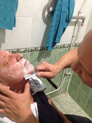 Человек постарше меня, карьеру свою начинал военным летчиком, говорит, что в молодости в парикмахерской испытал бритье опасной... Из инструметов: - бритва Wade & Butcher (куплена здесь, ну соответсвенно и заточена прекрасно); - ремень подвесной Накояяма; - помазок Baxter of California - барсук; - мыло Dr. Dittmar и капля крема Arko. Товарищ в восторге. Смотрели и фотографировали две барышни (тоже коллеги). После процесса они своими женскими ручками прощупали и сказали "офигеть". Сказали, что будут от мужей своих требовать такого же результата (по ходу, подставил я двух незнакомых мне мужчин). Брить другого человека сложнее чем себя, ибо не чувствуешь как идет. Но, неплохо получилось, гладко все и только одна кровая точка на шее. Ниже фото процесса. Последняя фото - рюмка Текилы после процесса. Настроение у всех отличное.