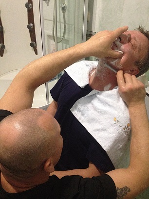 Человек постарше меня, карьеру свою начинал военным летчиком, говорит, что в молодости в парикмахерской испытал бритье опасной... Из инструметов: - бритва Wade & Butcher (куплена здесь, ну соответсвенно и заточена прекрасно); - ремень подвесной Накояяма; - помазок Baxter of California - барсук; - мыло Dr. Dittmar и капля крема Arko. Товарищ в восторге. Смотрели и фотографировали две барышни (тоже коллеги). После процесса они своими женскими ручками прощупали и сказали "офигеть". Сказали, что будут от мужей своих требовать такого же результата (по ходу, подставил я двух незнакомых мне мужчин). Брить другого человека сложнее чем себя, ибо не чувствуешь как идет. Но, неплохо получилось, гладко все и только одна кровая точка на шее. Ниже фото процесса. Последняя фото - рюмка Текилы после процесса. Настроение у всех отличное.