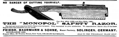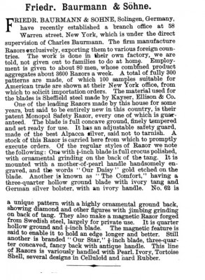(мой вольный перевод, ссылка и оригинал статьи под катом) "Недавно открыт филиал FRIEDR. BAURMAN N & Sohne, Solingen, на Warren street, 58 , Нью-Йорк, который находится под непосредственным управлением Charles Baurmann. Фирма производит бритвы и экспортирует их в различные страны. Работы выполняются на их собственном заводе примерно 80 рабочими, которые выпускают около 3600 бритв в неделю. В общей сложности модельный ряд состоит из 300 моделей, 100 из которых, подготовлены для американского рынка и представлены в их офисе в Нью-Йорке. Из них и собираются заказы для импорта. Материал, используемый для бритв, из Шеффилдской стали, произведенный на «Kayser, Ellison & Co» Одна из новинок этого ведущего производителя является патентованная «безопасная бритва» под маркой «Monopol», причем безопасность гарантируется. На полотно бритвы устанавливается специальная, регулируемая, защитная планка из мельхиора и «безопасная бритва» тут же готова к использованию. Эти бритвы всегда есть в наличии для оперативного выполнения заказов. Из основных моделей отметим следующие: Бритва с 5/8 дюймовым лезвием и зеркальной полировкой (full crocus polished), с декоративной шлифовкой спинки. Установлена перламутровая ручка с прекрасной гравировкой. Надпись “Our Daisy” золотом вытравлена на полотне. Другая бритва, известная как «Comfort», ¾ hollow ground, с эрлем в слоновой кости, ручкой из слоновой кости и мельхиоровой вставкой. На бритве Ν 62 уникальный декоративный рисунок, с изящным шлифованием на спинке эрля. Также производятся «магнитные» (magnetic Razor) бритвы из шведской стали. Это ¼ hollow ground и 5/8 дюйма ширина лезвия. Магнитные свойства позволяют держать заточку дольше. Еще один бренд «Our Star» это 5/8 лезвие, вогнутость ¾ дюйма с фантастической антикварной ручкой. У этой линейки бритв ручки обрабатываются жемчугом. Сами ручки из слоновой кости, панциря черепахи, целлулоида или эбонита." Spoiler Show