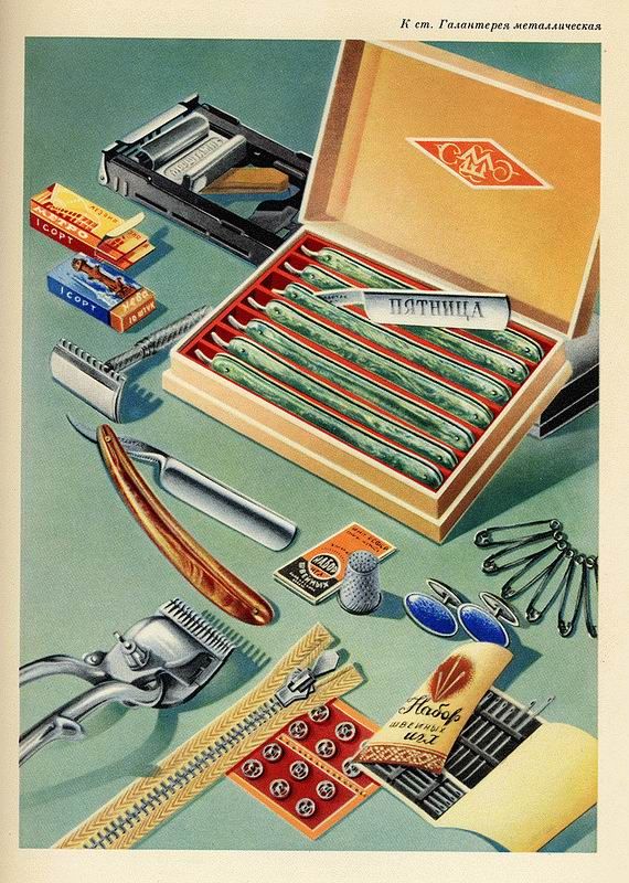 Вот оригинал картинки Отсюда http://www.webpark.ru/comment/82935 Товарный словарь Советского союза (133 фотографии) За скучным названием прячется одно из интереснейших справочных изданий советской эпохи. Цель издания этого 9-томника - ознакомить руководящих работников торговли с ассортиментом товаров народного потребления, выпускамых советской промышленностью. Он содержит громадное количество подробных описаний различных товаров, например состав колбасы "Докторская" или того, из каких именно марок латуни делают самовары. Кроме того, множество статей объясняют, например, чем отличается надглазурная роспись от подглазурной, какие существуют виды алмазной грани, как делают советское виски и т.д. и т.п. В каждом томе около двух десятков цветных вклеек,отпечатанных на прекрасной немелованной бумаге с особым, характерным только для 50-х и начала 60-х, шиком. Черно-белых же картинок в этом издании тысячи. Качество его полиграфического исполнения чрезвычайно высоко. Показываю только цветные картинки, не все. А какие ножи были в свое время Spoiler Show Олег Бритва писал: