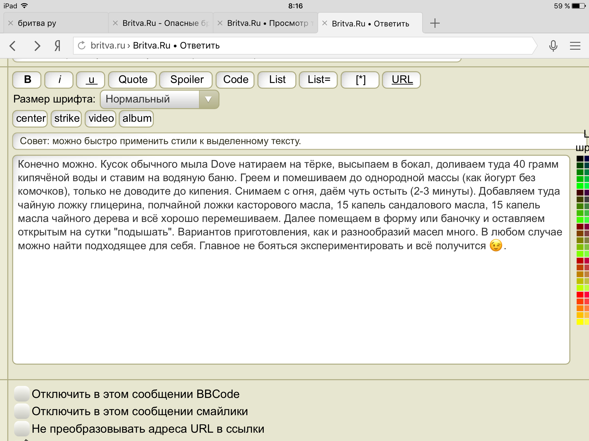 Я уже около года делаю мыло себе сам. Вычитал здесь на форуме рецепт, как из обычного сделать мыло для бритья. Сходил в аптеку, закупил всё необходимое и приготовил. Не сразу получилось, но со временем в ходе экспериментов добился чего хотел. Сейчас пользуюсь только им и не только я. Жене нравится использовать его для лица. Иногда по просьбе для знакомых делаю. Вроде пока всех устраивает.