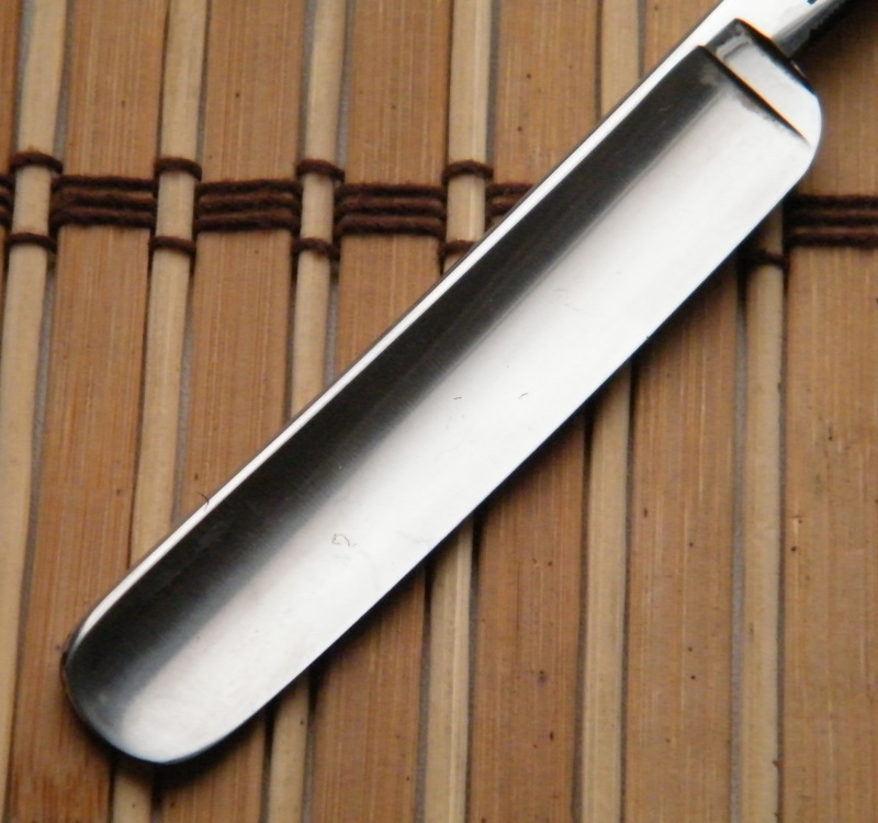 Прокладкой между частями ручки служит свинцовый металл. К сожалению, такие перламутровые ручки довольно хрупки. Большая удача для современного коллекционера – найти образец этой красивейшей ручки без трещин и сколов. Мне повезло найти две такие бритвы, но обе были со сломанными ручками. Было отмечено, что ручки были разных размеров под разную ширину бритв.