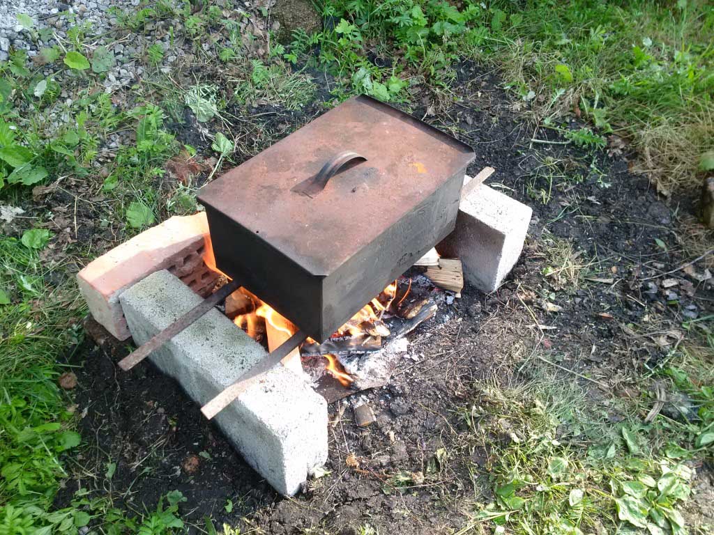 Ингредиенты - все, что есть под рукой: картошка, помидоры, мясо, рыба, курица. Делали даже из рыбных консервов и из тушонки. Готовят все по разному. Я всегда одним способом: на противень чуть масла, по стенкам рукой размазать, мясо (смесь из разного мяса, потрошки если есть, чем разнообразнее тем вкуснее), картошка, лук, помидоры, майонез или сметана, кетчуп по вкусу. Все слоями. В трубу на костер. 40 минут не подходим, не отвлекаемся, работаем. Собственно и все. У меня вместо трубы (пришлось оставить при разводе) прямоугольная коптильня-ящик из Ашана за 500 руб, начала уже прогорать, да и черт с ней, года 3 уже проработала, вполне нормально. Ветки вишни, рябины, смородины, груши - для ароматического акцента. Но не переборщить, а то горчить будет. Ягоды вишни случайно попали, как обломал ветку, так и обломал. Вообще забавно, что люди выковыривают именно картошку из блюда, а не мясо. Именно аромат блюда нравится.