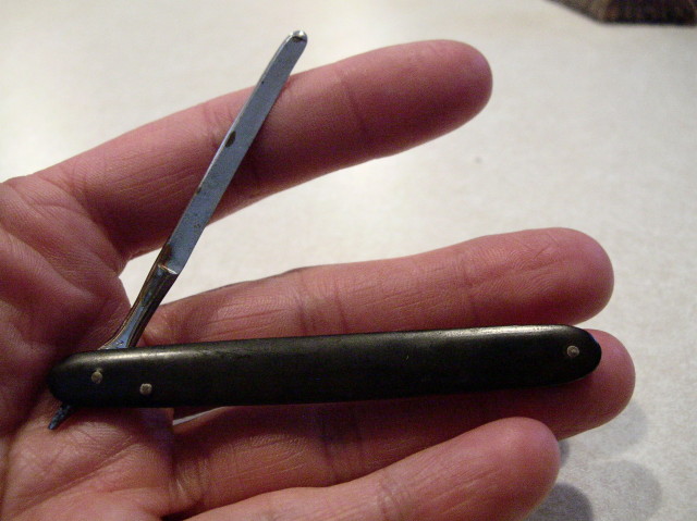 Up for auction is this vintage small straight edge. There us a small makers mark on the blade, but I cannot read it. The handle is plastic of some sort. Total length opened is 5 1/2", blade length is 2 1/4" and the handle length is 3 1/4". The blade is 3/16" wide. Excellent vintage condition. Email with questions. Thank you for your interest.