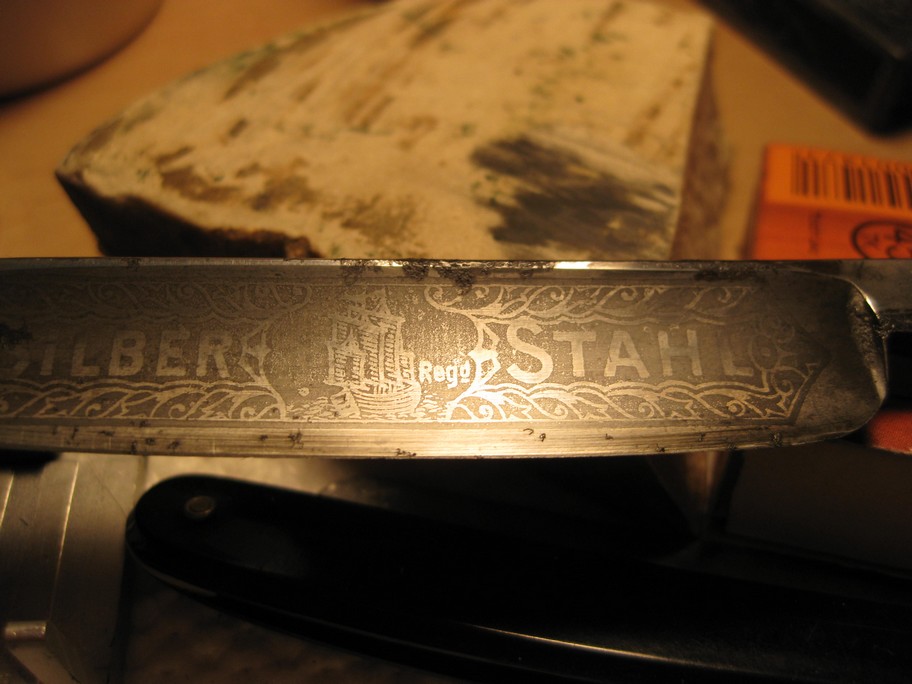 Подарили убиенную бритву, без опознавательных знаков, валялась на рабочем столе - жена разглядела в лупу 7-и кратку, под каким-то супер косыми лучами света, наличие в прошлом травления на лезвии. Стало интересно,- из опыта с ножами научен мягкому травлению лимонным соком: положил бритву в горизонтальное положение, с пипетки налил соку с горкой.( идея такова - травление темнит, после полирую слегка, аккуратненько: верх зачищается, углубления - темные остаются). В итоге... - потемнение начинается минут через 10, и старое травление видать в деталях. Заканчиваю через час, мою аккуратненько (не тру!!!), сушу ..углубления высветлились, а кругом них металл - потемнел... :scratch: ...может гравировка все-таки...