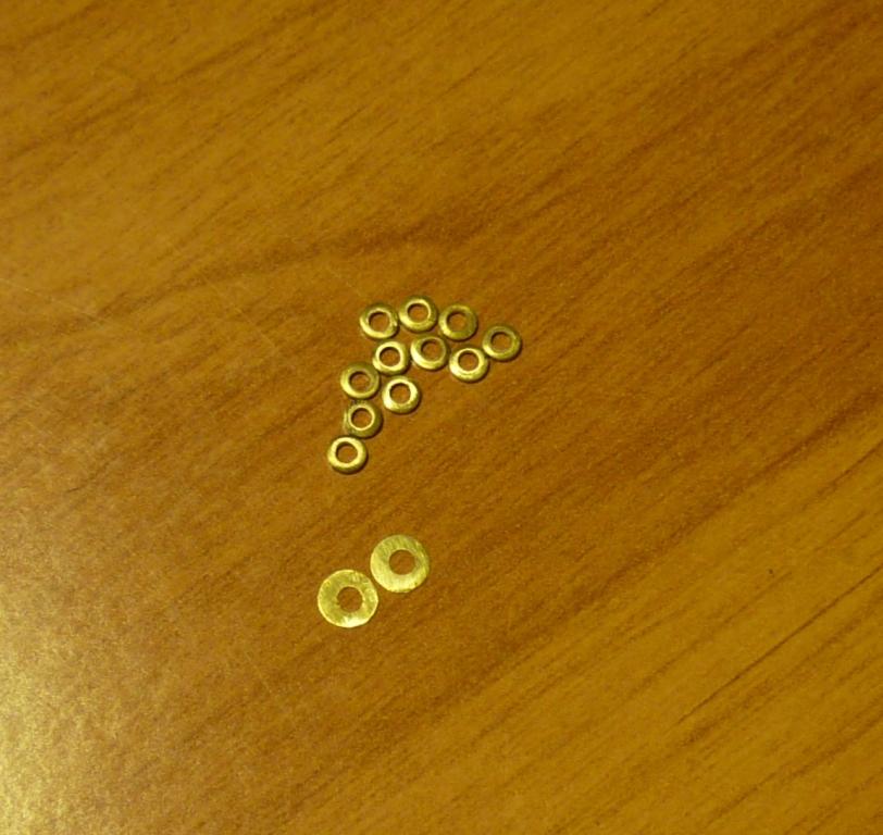 1) Шайба латунная выпуклая: наружный диаметр - 3 мм, внутренний - 1,6 мм, высота- 0,7 мм. Толщина материала - 0,5 мм. Цена 20 рублей за 1 шт. 2) Шайба прокладочная латунная плоская: наружный диаметр - 4,5 мм, внутренний - 2 мм, толщина - 0,1 мм. Цена 20 рублей за 1 шт. Были применены в частности мна этой бритве