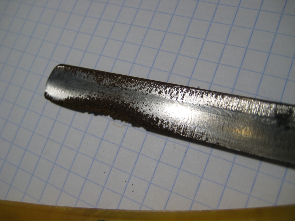 Внимание, целлулоид - убийца бритв.Довожу до сведения форумчан, что есть такая опасность, как старый целлулоид, который спустя десятилетия становится активным пожирателем стали. Вот фото такого откровенного жора. Бритва лежала сухой, в правильном шкафчике, специально оставил её для эксперимента и показа, что делает химия с бритвой ( эксперимент длился 1-1.5года).