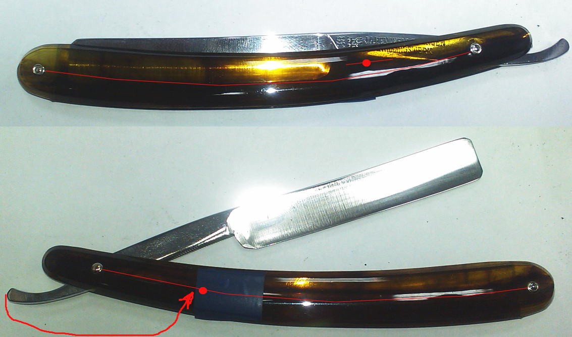 Делаю бритву нашего форумчанина - erikovich. Столкнулся с серьёзной проблемой - спинка у бритвы очень узкая. Кто-то когда-то реставрировал бритву и перестарался. Сточили бритву, но грамотно - геометрия осталась, а вот спинка стала тонкой и проваливается сквозь ручку. Встал вопрос о установке упора - ограничителя. И тут я капитально лопухнулся (причём второй раз наступил на те же грабли). Я заклёпку-ограничитель поставил ровно посередине ручки - ближе к заклёпке на эрле. Результат - при попытке раскрыть бритву и поставить в рабочее положение - хвостовик упирается в заклёпку-ограничитель и не даёт дальше раскрыть бритву. Я ставлю вторую ручку, причём ось на эрле смещаю так, чтобы утолщение головки было как можно ближе ко второй заклёпке - там уже расстояние между половинками ручки. В принципе - ужЕ не проскакивает, но если посильней (прилично так, не очень слабо) нажать - зажимает крепко полотно. Вытаскивая - можно рубануть по пальцам... На ваш суд, господа! Чё делать? Если ставить заклёпку-ограничитель, то только выше середины ручки. Нарушается эстетика. Может ограничитель не ставить, а хозяину сильно на спинку бритвы не давить? Вот типа схемка: На верхней схеме - место куда придётся ставить заклёпку. На нижней схеме - ход хвостовика и максимально близкое к середине оси ручки место установки заклёпки чтобы хвостик эрля не упирался в заклёпку а поворачивлся без помех. В этом положении есть минус - эрль не достаёт до заклёпки-ограничителя и всё-равно полотно можно вдавить в ручку. З.Ы. Понятно объяснил? Ремонт опасных бритв, звонить с 11-00 до 23-00, +79267729357, (viber, whats app, telegram, VK), спросить Олега.