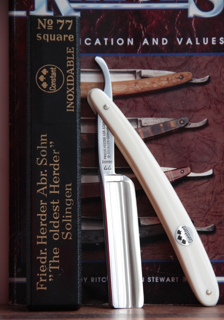 Не знаю,сколько эта бритва просто пролежала невостребованной, но пришла ко мне с достаточно толстым слоем патины( не ржавчины). Единственно что я сделал, так это немного почистил хвостовик и обушок от налёта вековой грязи, в полотно протёр полиролью вручную. Всё. Больше никаких работ не делал. Бритва полностью в оригинале: родная оправа, родные пины. Не знаю, разбиралась ли бритва за столько лет, но всё стоит качественно, без люфтов. Специально не стал зализывать полотно бритвы в зеркало, а оставил благородный налёт патины, что более красиво и естественно смотрится,для бритвы такого возраста. (ИМХО, конечно).Сама сталь не имеет коррозии , рытвин и других дефектов.Не смотря на такие размеры и такую форму лезвия, кромка и фаска на обушке достаточно равномерны, что для меня означает, что бритва была и использовалась профессионально, бережно и прямыми руками. Натуральный рог также в прекрасном состоянии, за исключением небольшой коцки снизу.Не смотря на тяжёлый клинок, ничего в конструкции не болтается и не люфтит. Имеется родной "гробик"-коробочка. Бритва заточена, проходит тест на рез волоса и готова снова встать в строй не только на полку, но и быть использованной по прямому назначению.Положительные эмоции от пользования инструментом древних предков гарантированны.
