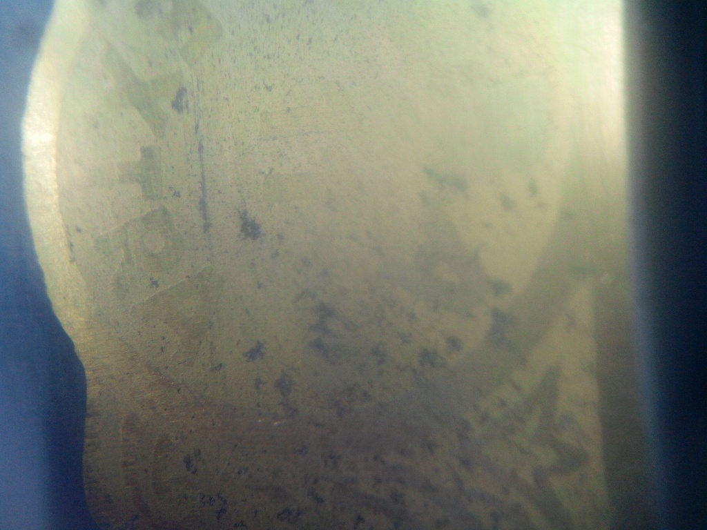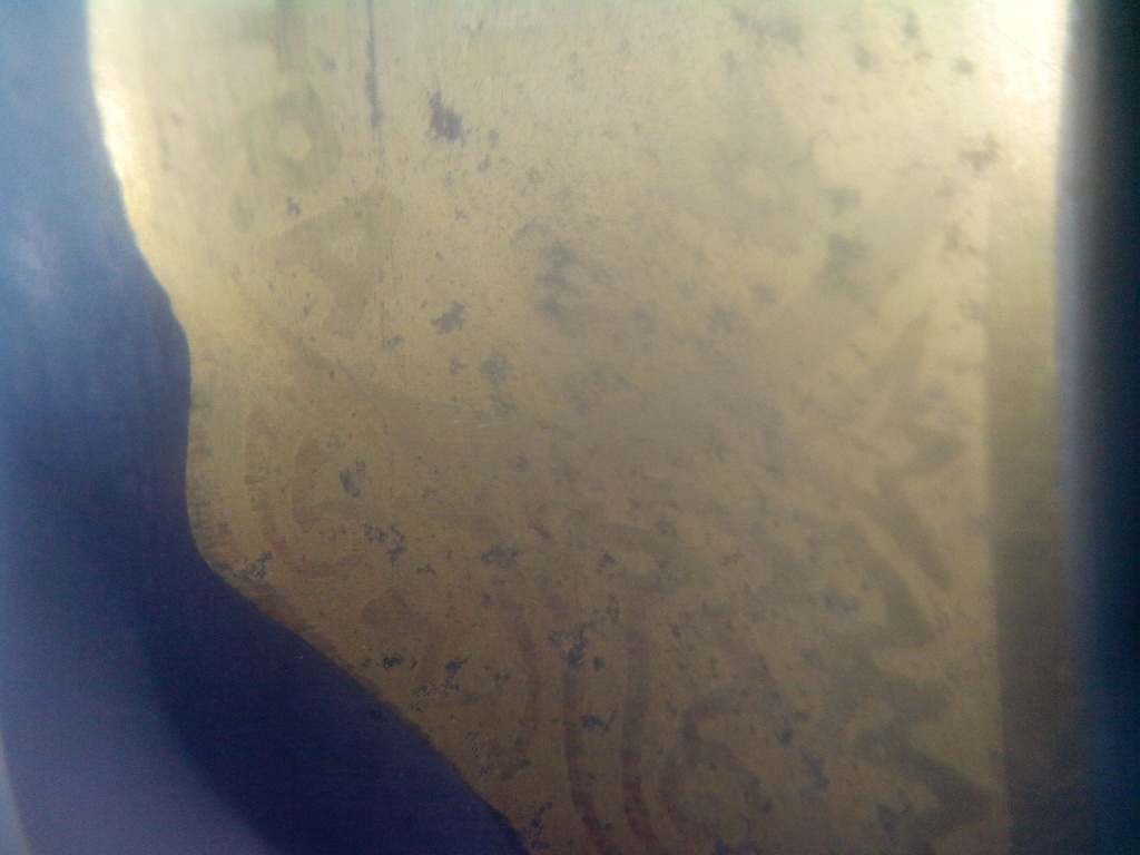 Итак, попытался оставить рисунок и опустил в горяченький раствор лимонной кислоты. Пока держал секунд по 5-10 все было нормально, протупил и через 20-30 сек - афронемец получился Ржавчина на лезвии у края РК, оказалась не сквозной (макро делал телефоном и подсвечивал телефоном). Spoiler Show