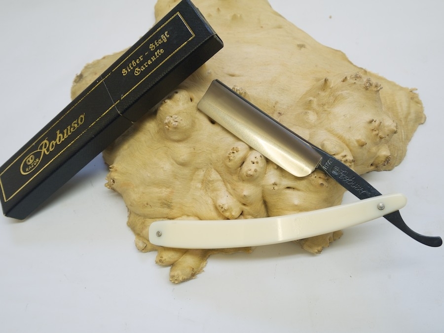 Не так давно являлся владельцем японского варианта бритвы ROBUSO 1972. Причем на бритве стояло клеймо известнейшего Танифуджи Фукутаро. Знал что есть немецкий Робусо и решил что совпадение названий не более чем совпадение, но сейчас вгляделся в клеймо и увидел все тот же золингеновский крендель. Возможно ли что марка была куплена японцами или штамповали втихую???