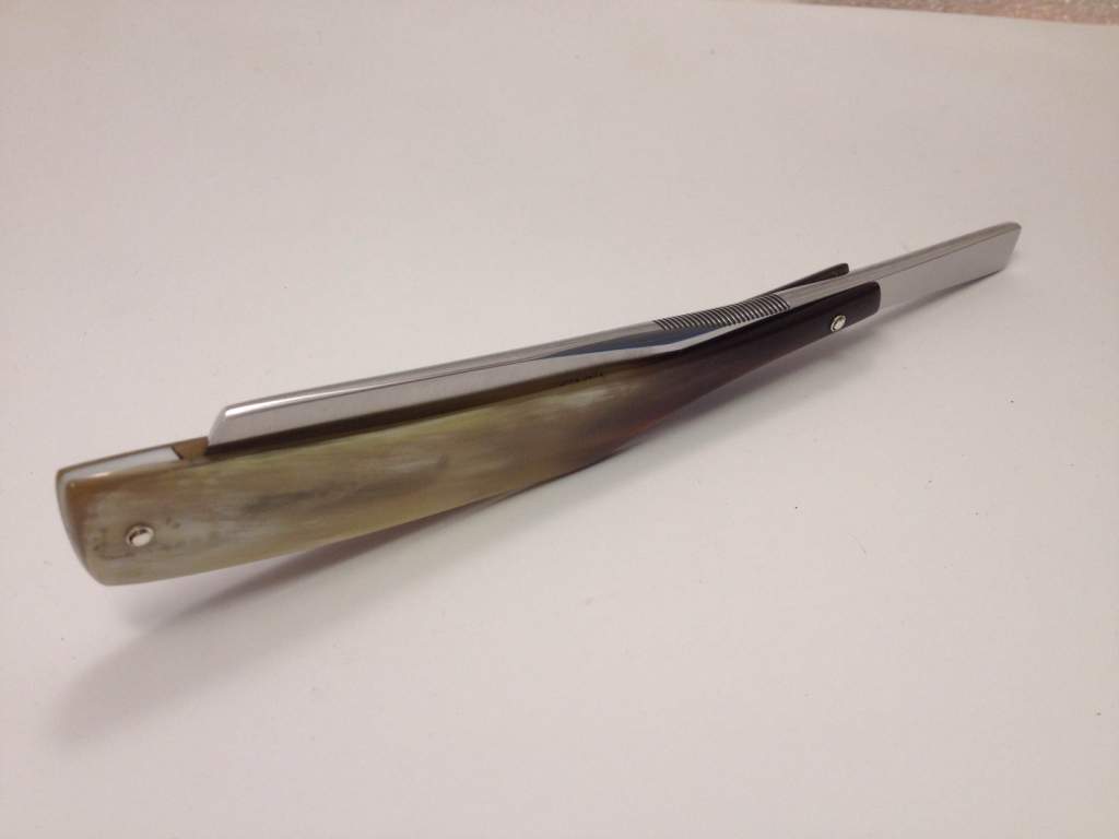 Сталь - 01 Ручка - рог Пины - серебро Общая длина - 170 мм Длина кромки - 55 мм Ширина лезвия - 19 мм Толщина обуха - 5 мм Все-таки бритва с длинным хвостовиком удобнее в руке, а с европейской ручкой так вообще. Эксперимент мне понравился. Одним ударом дерева не срубишь. . Татарская поговорка
