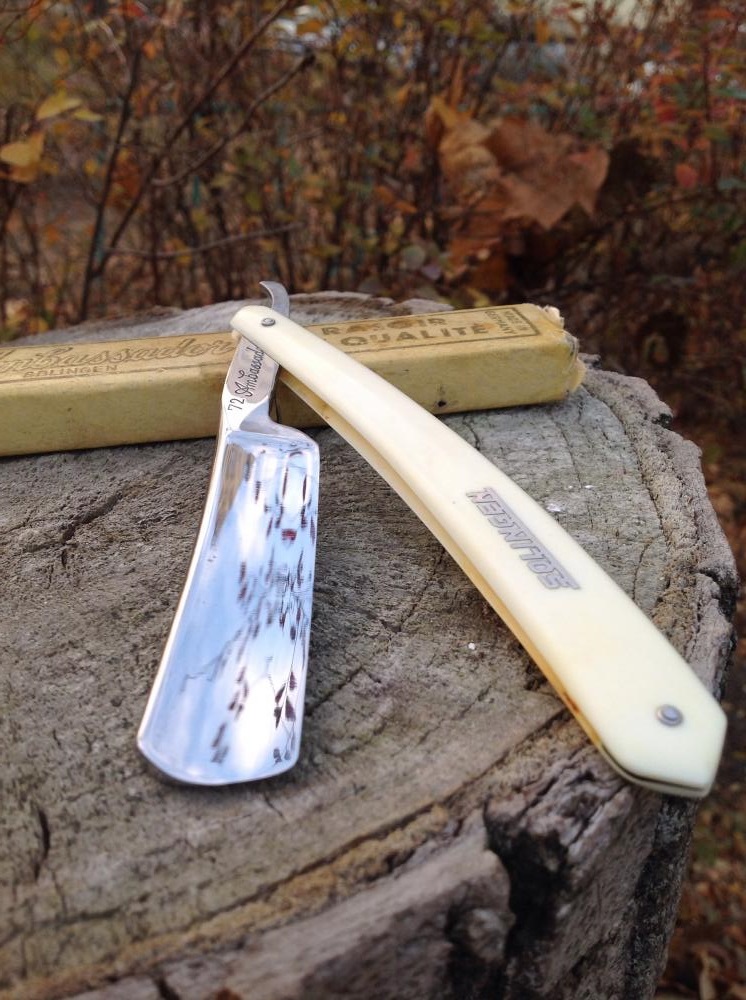 Ручка родная, в прекрасном состоянии, клинышек кость. Нижние пины от Егора. Полотно в хорошем сохране. Кромочка- ниточка! Длина режущей кромки 83 мм!!! Заточка как всегда N*X*S Spoiler Show Серьезный немец. Ширина полотна 6\8. Есть небольшие цяточки под обушком. Родной. кофр. Интересная форма. Бритье на "5+" Продана. Spoiler Show
