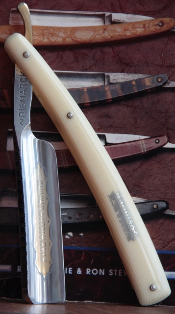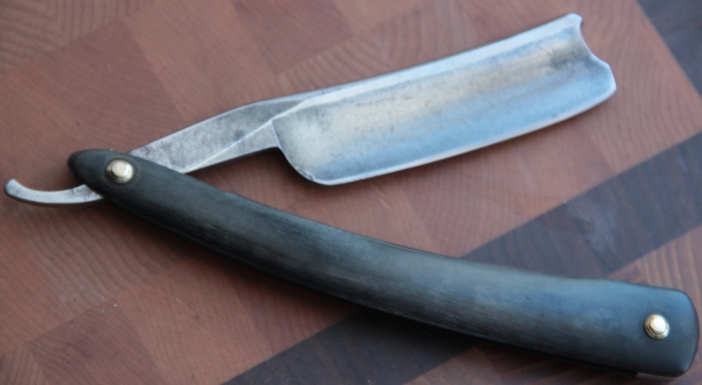 Не знаю,сколько эта бритва просто пролежала невостребованной, но пришла ко мне с достаточно толстым слоем патины( не ржавчины). Единственно что я сделал, так это немного почистил хвостовик и обушок от налёта вековой грязи, в полотно протёр полиролью вручную. Всё. Больше никаких работ не делал. Бритва полностью в оригинале: родная оправа, родные пины. Не знаю, разбиралась ли бритва за столько лет, но всё стоит качественно, без люфтов. Специально не стал зализывать полотно бритвы в зеркало, а оставил благородный налёт патины, что более красиво и естественно смотрится,для бритвы такого возраста. (ИМХО, конечно).Сама сталь не имеет коррозии , рытвин и других дефектов.Не смотря на такие размеры и такую форму лезвия, кромка и фаска на обушке достаточно равномерны, что для меня означает, что бритва была и использовалась профессионально, бережно и прямыми руками. Натуральный рог также в прекрасном состоянии, за исключением небольшой коцки снизу.Не смотря на тяжёлый клинок, ничего в конструкции не болтается и не люфтит. Имеется родной "гробик"-коробочка. Бритва заточена, проходит тест на рез волоса и готова снова встать в строй не только на полку, но и быть использованной по прямому назначению.Положительные эмоции от пользования инструментом древних предков гарантированны.