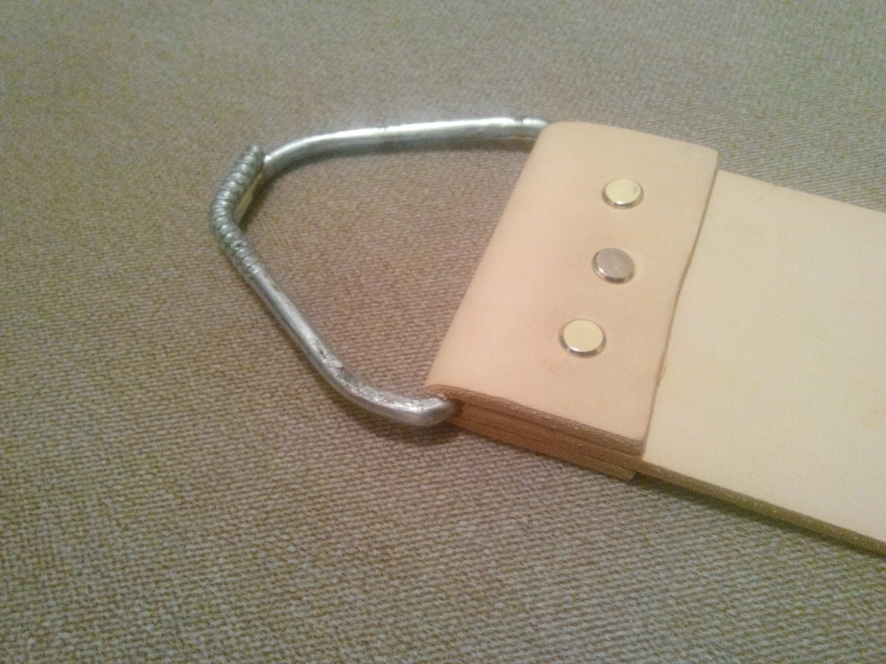 Кусок кожи, скобы за 20 р и заклепки. Шлифовка, пропитка. Получилось приемлемо, свои функции выполняет.