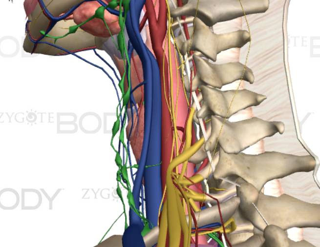 Спец наз резать вообще не обучают, т.к. эффективность стремится к нулю, это только в кино так делают. Все мышцы удалены, вид сзади сбоку, сонная артерия прилегает прямо к трахеи изнутри