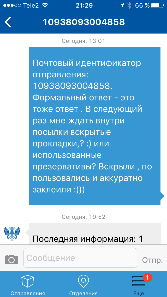 Зашел на чопту, а мне "мы работаем только по извещениям. До свидания." Начал пыхтеть, мол че за фикня, почему так долго идет, уговорил, посмотрели треки, ответ: "Ну наверное мы еще обрабатываем. Народу мало, посылок и писем много. Ждите извещение". Вот такая грусть Перестаньте тереть, не успеваю выделять смазку !!!