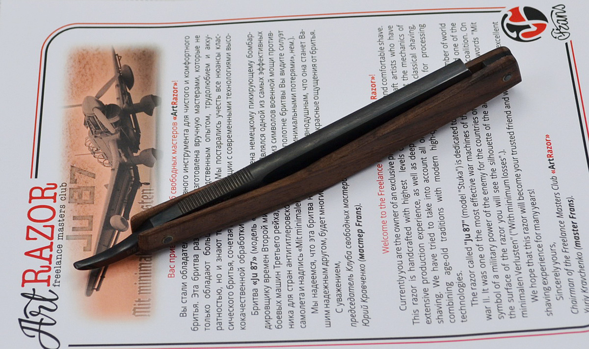 Те же участники. Сталь: Udeholm arne (Швеция) Ширина 5/8, оксидирование, лазерная гравировка, ручка - палисандр. По форме повторяет плоскость крыла типа чайка. Во избежание холивара, скажу, что проект занейтрален, не несет в себе никакой политической составляющей, и является просто очередной работой на тему - военная авиация. Анонс: следующая в этой теме будет Пе-2. Ju-87 Show