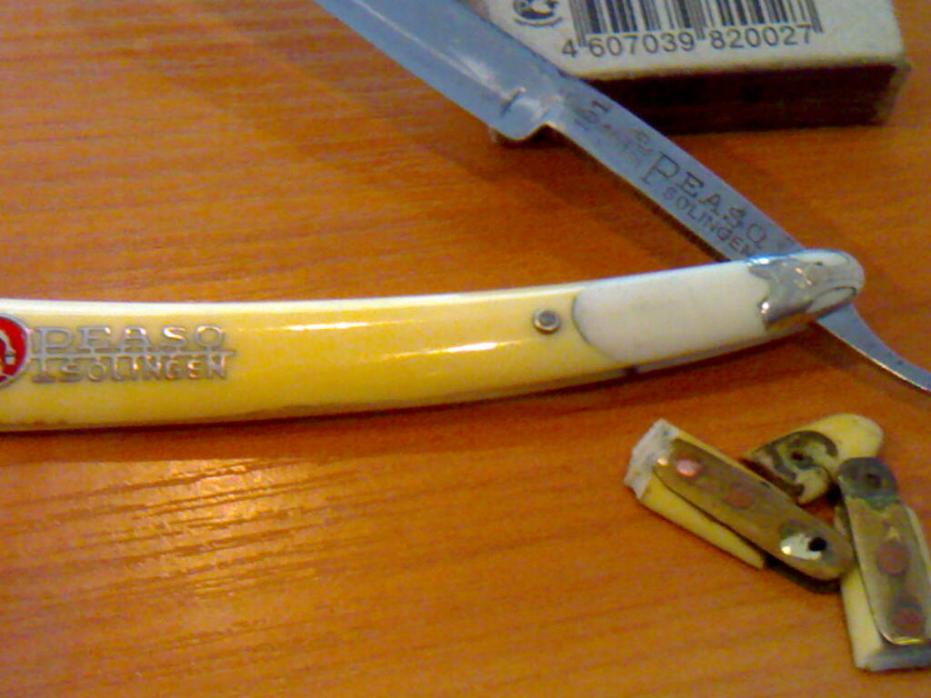 А вообще народ уходит от корней, обычное лезвие от ножовки за 7-10 рублей спасет от разоерения Re: Ремонт ручкиКупил бритву Paul Adrian, Peaso, Solingen, на форуме я её выставлял. Ручка была поломана, и склёпана медными заклёпками. Решил ручку не менять. Вставки делал из пластика .