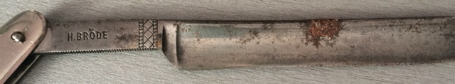 Re: Неизвестная бритва.Честно говоря, не увидел я обмылка, ну 4/8 она вроде. Ржу убрать - нормальная бритва. А ручку и поменять недолго. Жил на сете человек, только не H.Brode, а H.Bröde. Тема по Louis Perlmann, а Брёде, ну он просто чувак какой-то. Заказал со своей фамилией, надо ему было свой магазин проталкивать. Поиск не дал ничего. Ремонт опасных бритв, звонить с 11-00 до 23-00, +79267729357, (viber, whats app, telegram, VK), спросить Олега.