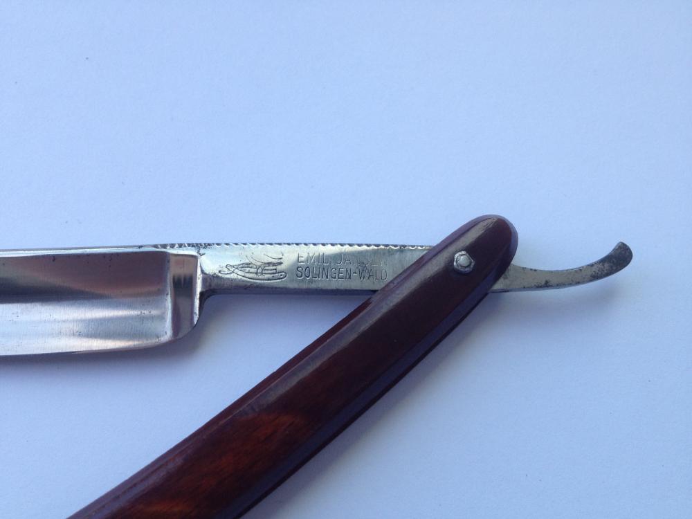 Re: EMIL JANSEN SOLINGENАккуратненький, практически не пользованный, Янсен. Ширина лезвия 15 мм, ручка пластик "под дерево", внутри на ручке цифры 4/8 и G в круге. Состояние прекрасное, легкая поверхностная коррозия (местами).