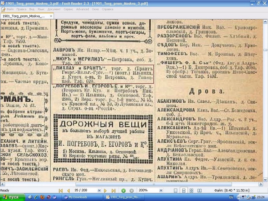 "ПИХЛАУ и БРАНТЪ" - существует с 25 января 1884 года. За выходом члена Эдмунда Августовича Пихлау, представителем торгового дома состоит Георгий Вильгельм Брант , потомственный почетный гражданин. Торгует резиновым и гуттаперчивым товаром.... данные точные Spoiler Show О ЧЕМ ПИСАЛИ ПСКОВСКИЕ ГАЗЕТЫ: "НОВОЕ ОБЩЕСТВО" Во вторник, 5 ноября, в зале "семейного кружка" происходило первое общее собрание только что утвержденного псковского велосипедного общества. В этом собрании были произведены выборы "должностных" лиц общества. Председателем и вице-председателем общества единогласно избраны И. Н. Новосильцев и Р. А. Прейс, казначеем В. С. Седельщиков, секретарем В. М. Кацнельсон, распорядителем П. А. Адамович и врачом Э. А. Пихлау. "Псковский городской листок", 1896, № 85 Re: pychlau & brandt moskauДа работа большая, респект и уважение