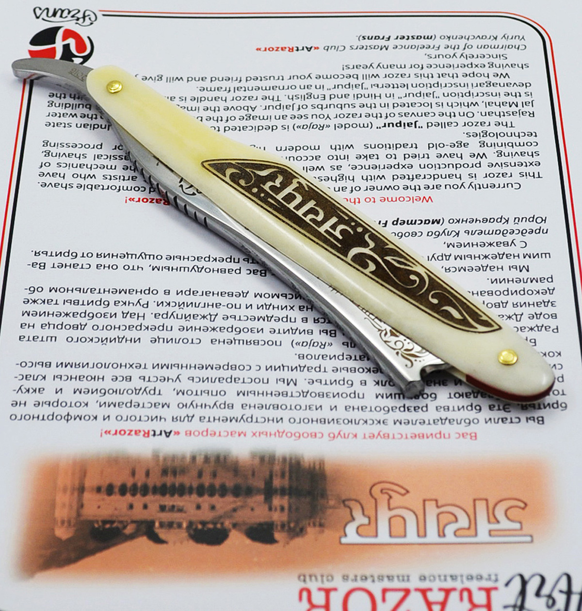 Бритва в индийском стиле RAJA Frans, Toivo, Gipson Сталь - У-12 Ширина - 7/8 Вогнутость - Клин Ручка - кость(верблюд) Лазерная гравировка металл/кость Не продана