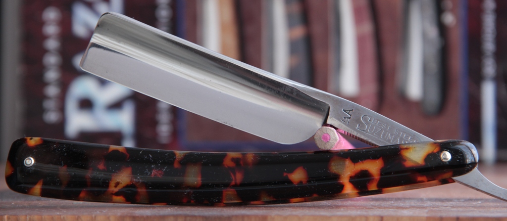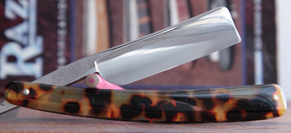 Короче, новая пластиковая оправа. Пины со втулками и шайбами. Бритва тяжёлая, удобная и очень красивая. С полотном ничего не делал. Всё чисто, без каких либо проблем. Идеальная геометрия изготовления полотна. Кромочка тоненькая по всей длине. Заточена, проходит тест на рез волоса и полностью готова к бритью.