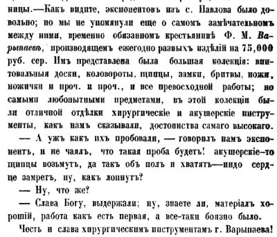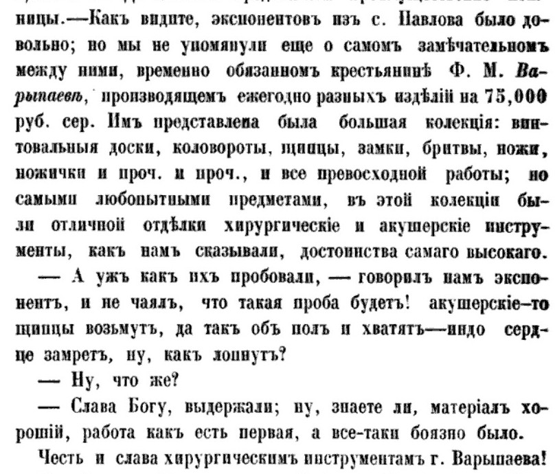 Видной фигурой в истории Павлова стал Ф. М. Варыпаев, крестьянский сын (до отмены крепостного права в 1861 году был крепостным графа Шереметева), в 14 лет вступил в управление небольшим заведением с 1833 года, по смерти своего отца, при котором, как сказывал, в основном было незначительное производство одних замков. Едва знавший грамоту мальчонка понял, что, если не сможет расширить ассортимент изделий, конкуренции ему не выдержать. Сначала он пошел на выучку к мастерам ножевого дела, потом освоил изготовление ножниц. Трудолюбием и искусством Варыпаев довел свое заведение до степени первоклассного в селе Павлово, и возвел заведение в первостепенное. Со времени принятия заведения он усвоил себе все разнообразные производства стальных изделий. У него выделываются замки медные и железные, простые и с секретами, разных размеров, ножи столовые, хлебные, складные и перочинные, ножницы всех возможных сортов, кинжалы, бритвы и хирургические инструменты. Расширение ассортимента продукции и постоянный контроль качества позволило молодому предпринимателю избавиться от произвола местных скупщиков, и напрямую заключать договоры с крупными торговцами. Постоянное стремление быть первым охватывало все стороны жизни этого незаурядного человека, не может не обратить на себя внимание и тем, что он не останавливается на пути усовершенствования. Со временем Варыпаев превратился в крупнейшего и самого авторитетного павловского фабриканта, завел магазин в Нижегородских ярмарочных рядах, наладил торговые связи с Москвой и Петербургом. Он знал до тонкости все секреты производства, сам обучал мастеров, а когда нужно было изготовить редкостный выставочный экземпляр, надевал кожаный фартук и самолично вставал к станку. У него должны были быть лучшие работники, с самой высокой зарплатой; собор, рядом с которым он жил и был в нем церковным старостой должен быть самым красивым, и так во всем. О хирургических его инструментах эксперты Петербургской и Нижегородской выставок выразились почти одинаково: инструменты батальонного набора, хотя и по образцам уже устаревшим, хороши; акушерский инструмент очень хорош и удивительно дешев; акушерские щипцы «Буша» сделаны весьма удачно, все пробы выдержаны ими как нельзя лучше. Почему заключение экспертов таково, что для полного усовершенствования в этом самом высоком роде стальных изделий необходимо иметь Ф.М. Варыпаеву лучшие новейшие образцы и ознакомиться с назначением каждого инструмента. Он работает по заказу и для адмиралтейства циркули, кронциркули, стамески и другое. На его заведении делают самые разнообразные замки медные и железные, простые и с секретами, ножи всех сортов и размеров, ножницы, а также бритвы и хирургические инструменты, получившие одинаковые лестные отзывы на выставках как петербургской, так и нижегородской. Его инструменты выдержали все пробы на выставке как нельзя лучше, и притом они чрезвычайно дешевы. Он работает по заказу и для адмиралтейства и вообще его изделия, кроме внутреннего достоинства отличаются чистотою, простотою и вкусом, изящною отделкой. Великий Князь много любовался прекрасными хлеборезными и десертными ножами с мальвовыми и костяными ручками, чистотой и изяществом многих других вещей, купил несколько экземпляров и потом отправился в заведение, где особен