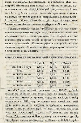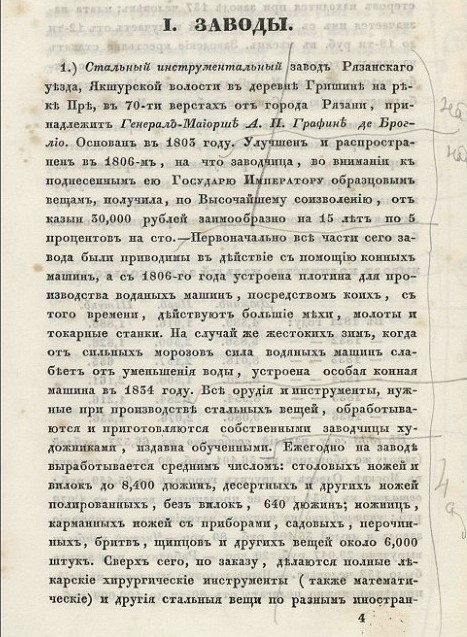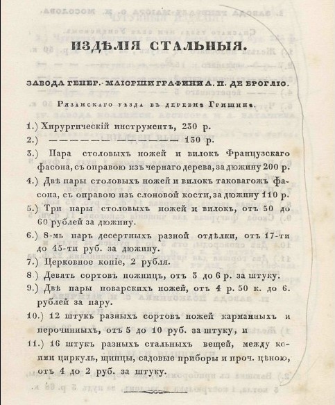 ВЕЩАМ Ь ВЫСТАВЛЕННЫМЪ ВЪ ПЕРВУЮ ПУБЛИЧНУЮ ВЫСТАВКУ РОСС1ЙСКИХЪ ИЗДФЛ1Й V ВЪ С ПЕТЕРБУРГ 1829 ГОДА РОСПИСЬ стр.18 "Хо 14 Инструменталъной Генералъ Магорши Графини А II Де Ироглю Рлзанской Губерти и уазд ъ Сшоловые ножи вилки разрЪзные усо вые ножи поваренные ножи ножи щипцы л Ькаргкле инсшруменшы операшорскле инсшру иеншы бритвы ц эласшика для дам СКИХ Ъ корссшовъ " ...http://books.google.ru/books?id=zjlAAAA" onclick="window.open(this.href);return false; ... q=&f=false Стальной инструментальный завод графини Анны Петровны де-Броглио (Брольо) основан в 1803 году, улучшен и распространен в 1806 году. Все орудия и инструменты, нужные при производстве стальных вещей изготовляются собственными художниками и мастерами (137 чел.), издавна обученными заводчицей. Ежегодно на заводе вырабатывается столовых ножей 8400 дюжен, десертных и других полированных (без вилок) 640 дюжен, карманных с приборами, садовых, перочинных, бритв, ножниц, щипцов и пр. около 6000 шт. Сверх того, по заказу делаются полные хирургические и математические инструменты, а также разные стальные вещи по иностранным образцам. Эти вещи идут большей частью из С.-Петербурга и Москвы, отличаются превосходной отделкой, отменной чистотой и прочностью. В 1833 году было продано в Москве, Одессе и др. городах на 65449 руб. В самое короткое время изделия завода получили такое широкое признание, что Император Александр I повелел выдать графине займ в 30000 руб. ассигнациями с рассрочкой на 15 лет. Завод построен на берегу р. Пры и расположен в 12 деревянных корпусах, из которых в 3 работа производится во время половодья. Завод состоит из следующих отделений: 1) кузница молотовая, секретная для сварки литой и простой стали и для отливки чугуна и разной композиции, с 4-мя механическими мехами, приводимыми в действие водой, с напряжением переводного духа к 24 горнам и к домне, 2) сложные машины, действующие водой, в которых производится шлифовка, глинцовка и полировка на 28 различных кругах и 15 токарных станках, 3) две точильни, действующие водой, по 20 станков в каждой, 4) томильная, для отпечатки разных усовых черенков, и столярная, 5) томильная с 3-мя химическими печами, 6) конный привод для точенья, полировки, шлифовки и для токарной на 30 станков. Работы здесь производятся временно, во время жестоких зим, когда от сильных морозов сила водяных машин ослабевает, 7) 3 особых деревянных корпуса, в которых размещены кузница с 24 горнами, точильня, шлифовочная и токарная на 50 станков, на случай полой воды, чтобы не прекращать работу. Все орудия и инструменты, необходимые при производстве стальных вещей, выделываются на самой фабрике, собственными мастерами. Материалы (железо для выделки стали, композиция, свинец, черное, змеиное и азиатское дерево, слоновая кость, перламутр, черепаха, рога буйвола, лосиная кожа, клей, бура, медь, сандал, купорос и т.п.) покупаются в столицах и на нижегородской ярмарке (всего на 70000 руб. серебром ежегодно). Фабричные изделия – разного сорта ножницы, ножи (карманные, садовые, столовые, конвертные, перочинные), бритвы, ланцеты, щипцы, хирургические инструменты и т.п. В 1857 году этих изделий было произведено 25194 дюжины, 6225 пар и 10117 штук. Главный сбыт – в Москве. Мастеровых 225 человек, при них русский мастер и, кроме того, 354 чернорабочих, обязанных вместо оброка содержать на фабрике караулы, ставить дрова и уголь и выполнять другие разные работы. Из мастеровых 