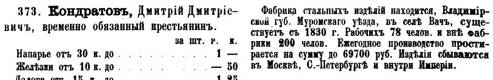 Аукционы: плагиат, развод и "великолепные" описанияСудите сами...источник официальный Среди владельцев «заводов» выделились местные крестьяне Кондратьевы. Д. М. Кондратьев в 1831 году работал по найму у павловских мастеров, а в середине тридцатых уже основал в Ваче «ножевую фабрику». Его сын Д. Д. Кондратьев расширил производство отца, и на его «фабрике» в начале пятидесятых годов работало, не считая надомников, восемьдесят пять работников. Они выпускали продукции на двенадцать тысяч рублей. Через десять лет на этой фабрике была паровая машина и работало уже сто шестьдесят человек и триста являлись надомниками. Продукция оценивалась в семьдесят тысяч рублей в год. http://www.museum.murom.ru/wwwmus/afish ... /pr_28.htm