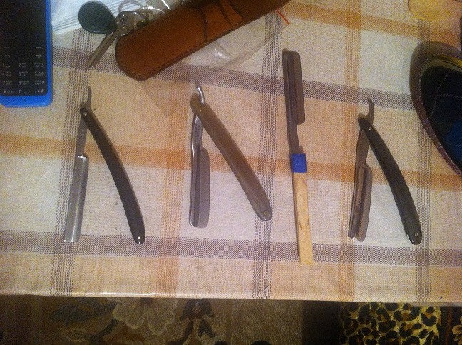 Итак был приобретен сет Naniwa SS 1000/3000/5000/8000/10000, позаимствован у младшего брата микроскоп + подарочный клинок для экспериментов ГД 66. Сегодня 3-й день как практикую. Итак имею клинок ГД 66 + сет камней что указан выше. В первый день точил на 1-ке(1000) 4 часа - ощущения в конце: приятная усталость + как будто получил каблуком под лопатку и как бонус 4-х угольный зад Ну что сегодня взял клинок и решил сделать все с 0, т.к. вдруг заусенец есть и большой(в микроскоп я не смог отличить разницу между своей заточкой и заточкой профи, а значит микроскоп не годится). Провел кромкой вдоль ребра 1-цы Naniwa и начал заново. Примерно час точил на 1-це, потом на 3-ке, затем на 5-ке. Устал решил посмотреть предпослению серию "Викинги" Решил перекурить, и посмотреть последнюю серию "Викинги". Вроде отпустило. Кстати по поводу помывки камней, сегодня 1-ка мылась примерно 15 раз, 3-ка 10 раз, 5-ка 10 раз, 8-ка примерно 8 раз, 10ка 5 раз. Решил сделать тест драйв на себе. Побрился, волос не драло, но по ощущениям как бритва после 20-ти раз использования без нормально правки, тоесть туповата. В конце чтобы понять все таки на сколько туповата бритва - промочил лицо лосьоном - почти не жгло. Значит бритва недоточена. Лицо визуально чистое, но на ощупь щетина слишком хорошо чувствуется. Вот как то так ГД на фотке со странной ручкой P.S. коричневый тазик с брусками это горшок для рассады