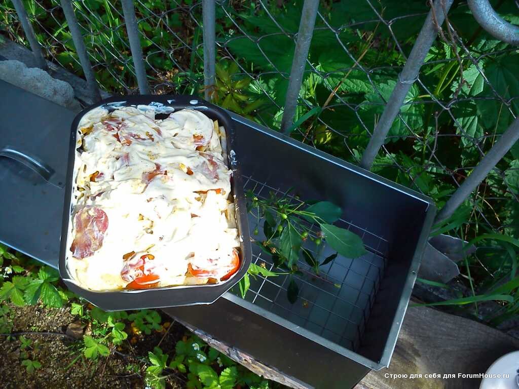 Ингредиенты - все, что есть под рукой: картошка, помидоры, мясо, рыба, курица. Делали даже из рыбных консервов и из тушонки. Готовят все по разному. Я всегда одним способом: на противень чуть масла, по стенкам рукой размазать, мясо (смесь из разного мяса, потрошки если есть, чем разнообразнее тем вкуснее), картошка, лук, помидоры, майонез или сметана, кетчуп по вкусу. Все слоями. В трубу на костер. 40 минут не подходим, не отвлекаемся, работаем. Собственно и все. У меня вместо трубы (пришлось оставить при разводе) прямоугольная коптильня-ящик из Ашана за 500 руб, начала уже прогорать, да и черт с ней, года 3 уже проработала, вполне нормально. Ветки вишни, рябины, смородины, груши - для ароматического акцента. Но не переборщить, а то горчить будет. Ягоды вишни случайно попали, как обломал ветку, так и обломал. Вообще забавно, что люди выковыривают именно картошку из блюда, а не мясо. Именно аромат блюда нравится.