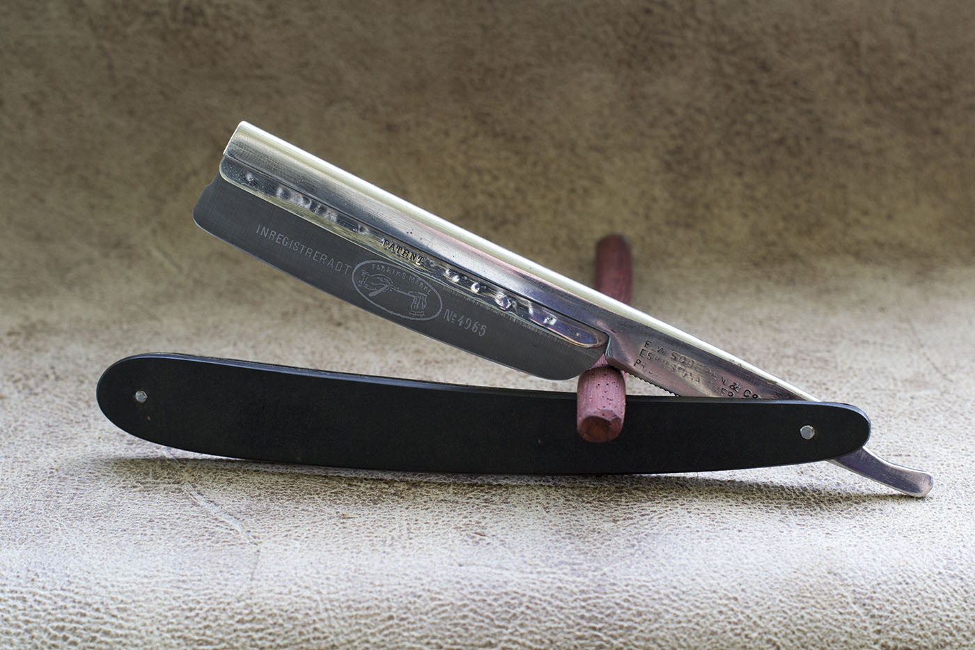 Немецкая опасная бритва начала 20 века. Бритва изготовлена в Германии для дилера в Нью Йорке F. Westphal, о чем свидетельствует надпись на эрле. Бритва находится в отличном состоянии, родная рукоять заменена на новую. Ширина 5/8, заточена, готова к бритью. Бритва является отличным вариантом для новичка, позволит ощутить все прелести качественной клинковой бритвы не переплачивая за марку. Изготовлена из качественной углеродистой стали, отличная геометрия. родная коробка утеряна, но я укомплектовал бритву новой коробки от другой немецкой бритвы. Так же в комплекте ремень для правки из КРС растительного дубления 600*60 мм. Продано Spoiler Show