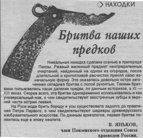 Первый тип - маленькие бритвы с ручкой в виде петли, заключенные в широкий футляр (табл. 9, 35, 42, 43). Бритва с плавным дугообразным лезвием свободно за креплялась на оси в железном футляре, имевшем только две боковые стенки. Близки к новгородским экземплярам берестейские находки. Различия малосущественны. Важнее более ранняя датировка одного из экземпляров, обнаруженная в слоях рубежа XI-XII вв. (Лысенко Н.Р., 1985. С. 248, 249). В середине XIII в. эти бритвы заменяются более совершенными образцами. По конструкции бритвы второго типа близки современным опасным бритвам. Различие заключается лишь в форме полотна. У современных бритв лезвие прямолинейное, а у бритв второй половины XIII в. дугообразное. Тонкая режущая часть полотна бритвы длиной около 100 мм имела стальное закаленное лезвие (табл. 9, 40, 46, 47). источник: http://rarog.in.ua/forum/lofiversion/in ... ?t259.html