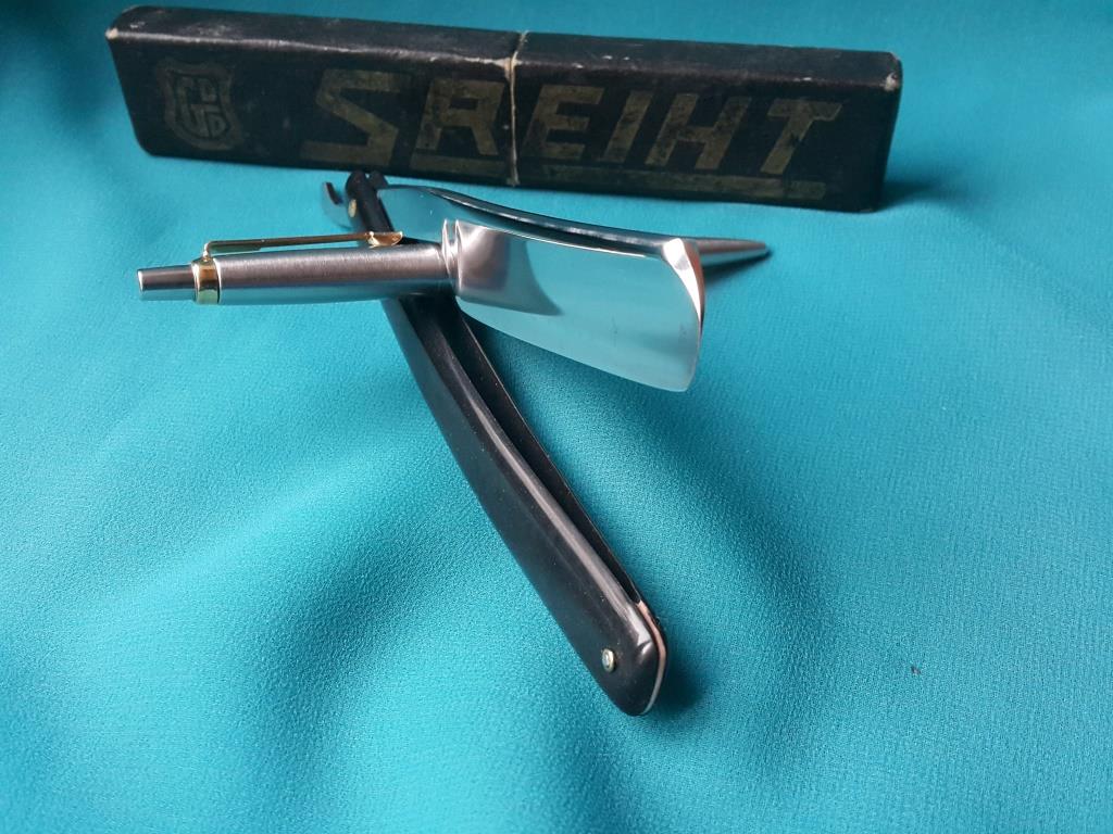 Параметры: ширина 6/8 ( 21мм ширина, обух 5.5 мм) , ручка из пластмассы, на полотне есть следы от времени, возраст понимаете ли. Бритва заточена и готова к бритью. Продано SREIHT Show