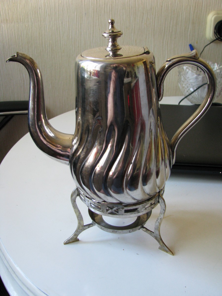 Коробка от столовых приборов, СТИЗ ( третий снизу в коробке) и кофейник. СТИЗ фоткал, но фоточки вышли плохие, не стал выкладывать. Точеный один раз, состояние на 5-, 50е гг. Отдельно хочу поговорить про кофейник. При ближайшем рассмотрении и полировке он оказался посеребреным! Очень тонкая латунька, щедро так покрытая серебром. На фото я его уже полирнул. Фото клейма прилагаю. Вдруг кто что подскажет, сам не нагуглил ничего. Осталось его отмыть изнутри и разжиться спиртовкой Муссолини харь псевдозаточкой. Типазаточник-параллельщик. Баблосгрёб.