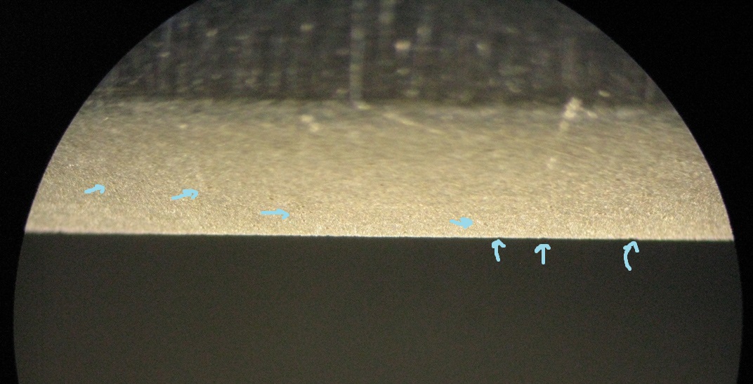 Решение нашлось простое - отдать мне бритву и камни и посмотреть что получится у меня. У меня всё получилось нормально. Неудача думаю была связана с геометрией бритвы - небольшой пропеллер и ямка с одной стороны, плюс не самая удачная сталь - крошливая. Вот так кромка была изначально. Видно что не самым лучшим образом проработана область возле кромки, возможно даже немножко завал. А вот так после камня. Тест на волос проходит, не везде конечно, щербины кое-где остались, но это не коммерческая заточка, так что перетачивать не стал, тут вопрос в другом был. Заказчик попробует в деле, если пожелает, отпишется. Под катом фото РК с 1000 и до финиша - Spoiler Show Бритва заточилась довольно легко, не стал даже весь сет нагур использовать и сделал по одному заходу 1000 3000, вот тут видно что подзавалил немножко и скольчиков поставил, нужно было сразу исправлять, тк потом они не ушли ботан тендзе Вот тут интересная история. На поверхности хороши видны более темные кристаллы, видимо это карбиды, их размер как раз соответствует скольчикам на кромкам - на фото тендзе указано стрелками. Такую картинку я в последнее время наблюдаю только при заточке с нагурами и крошливой нерже. Пока рано говорить о закономерностях, но если темные кристаллы крупные, то для меня это сигнал о проблемной заточке. Каких-то особых манипуляций не совершаю, просто точу далее, но очень-очень аккуратно. После кома начинает проходить тест - Финиш - почти чистый камень, точнее кома с разбавлением, т.е. не промываю от кома, а работаю дальше - Суперфиниш - в принципе бритва готова, сделал ещё пару махов на зеленом борде и хорош - PS - камень я кстати перепритер - не устраивала поверхность. В этом случае не думаю что дело именно в этом, камень был ровный, шероховатость не устроила, но, при общении с клиентами понял, что частенько проблемы у новичков начинаются с неправильно подготовленного к работе инструменте - то притирают абы как, то ХЗ что используют на заточном этапе, в итоге бритва с проблемными местами отправляется на доводку. Хорошо что суспензия нагур - абразив подвижный и везде достанет, но у всего есть пределы возможностей. Так что за состоянием камней надо следить и использовать проверенные решения, хотя бы пока не выработается техника. Комплексное решение заточки - подбор и подготовка к работе сетов на основе синтетики и/или натуралов, нагуры, притиры, мусаты и ремни для правки.