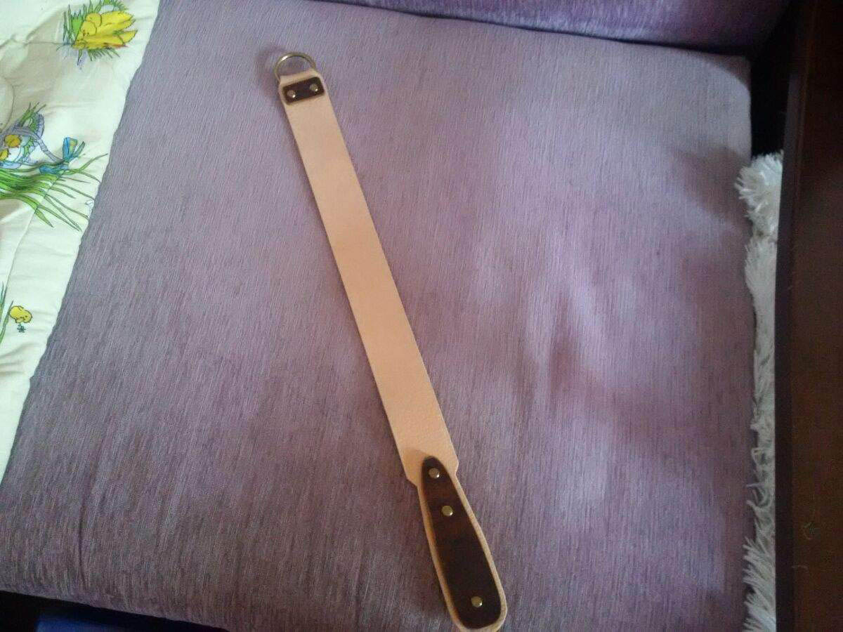 Re: Изготовление ремней для правкиВот мои труды, в другой теме писал, что перемаслил его (опрокинув баночку с маслом), но как оказалось ремень работает (как мне кажется, хорошо работает). Кожа и обвязка от Мони, фурнитура из магазина для шитья.