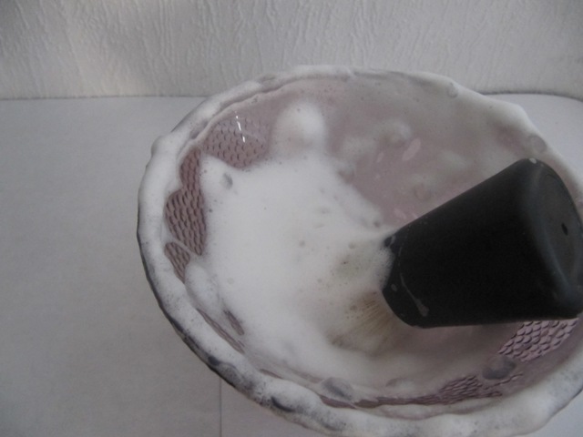 Первый же опыт взбивания пены из самодельного мыльного порошка приятно удивил. Дешевеньким синтетическим помазком я без труда получил довольно плотную, немного тянущуюся пену, использовав очень маленькую порцию, не более 1/3 грамма. Пена оказалась довольно стойкой. Да, подсыхание за 20-30 минут имело место, однако без хлопьев и корки. Просто пена становилась более вязкой и чуть липковатой. Но и в такой консистенции ей можно было побриться.