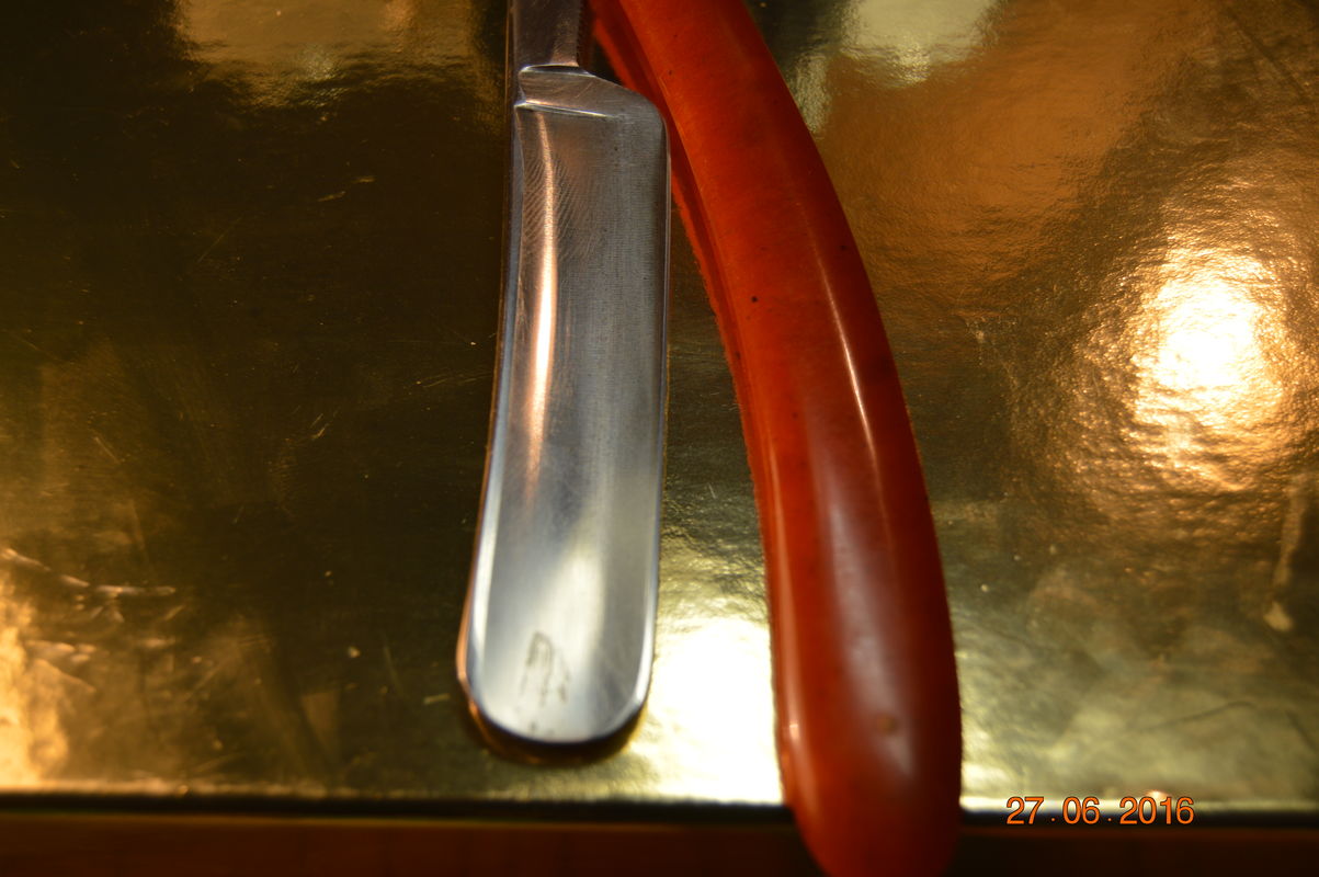 Re: Продаётся от artemarut1Spoiler Show Немецкий Ern, самого названия на бритве нет, но полумесяц это фирменный знак, на полотне гравировка орла, к сожалению на фото передать сложно. Ручка кость, пины латунь, клин рог, стоят осевые шайбы, есть родной домик. Размеры 19.5/5.5 (полотно/спинка) заточена. Цена Продано Spoiler Show