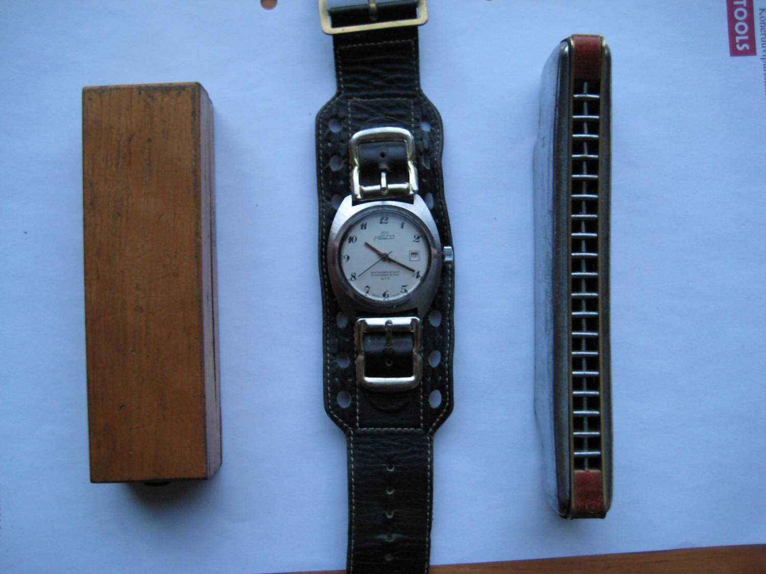 1) какой-то доводочный камень в дер. коробке небольших, правда, размеров: 11,5 х 2,6 х 1,5 (см.). Германия - 6,5 евро 2) губную гармошку "Blue Master". Германия - 2 евро 3) часы NEICO Swiss Made (waterresistant shockresistant G.T.5 - 6 евро. Часы и гармошки никогда не покупал, первая попытка...К часам отношусь довольно равнодушно: ношу, но всё равно какие, главное чтобы правильно время показывали и хлопот не доставляли. но тут не устоял и купил (механических у меня не было после школы никогда). Правда не знаю, что взял, неизвестная какая-то марка...может первый "блин комом". Идут вроде нормально (уже 6 часов проверяю). Spoiler Show