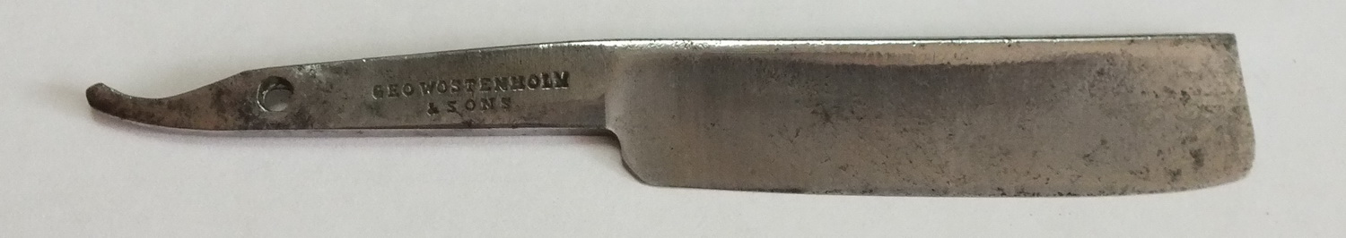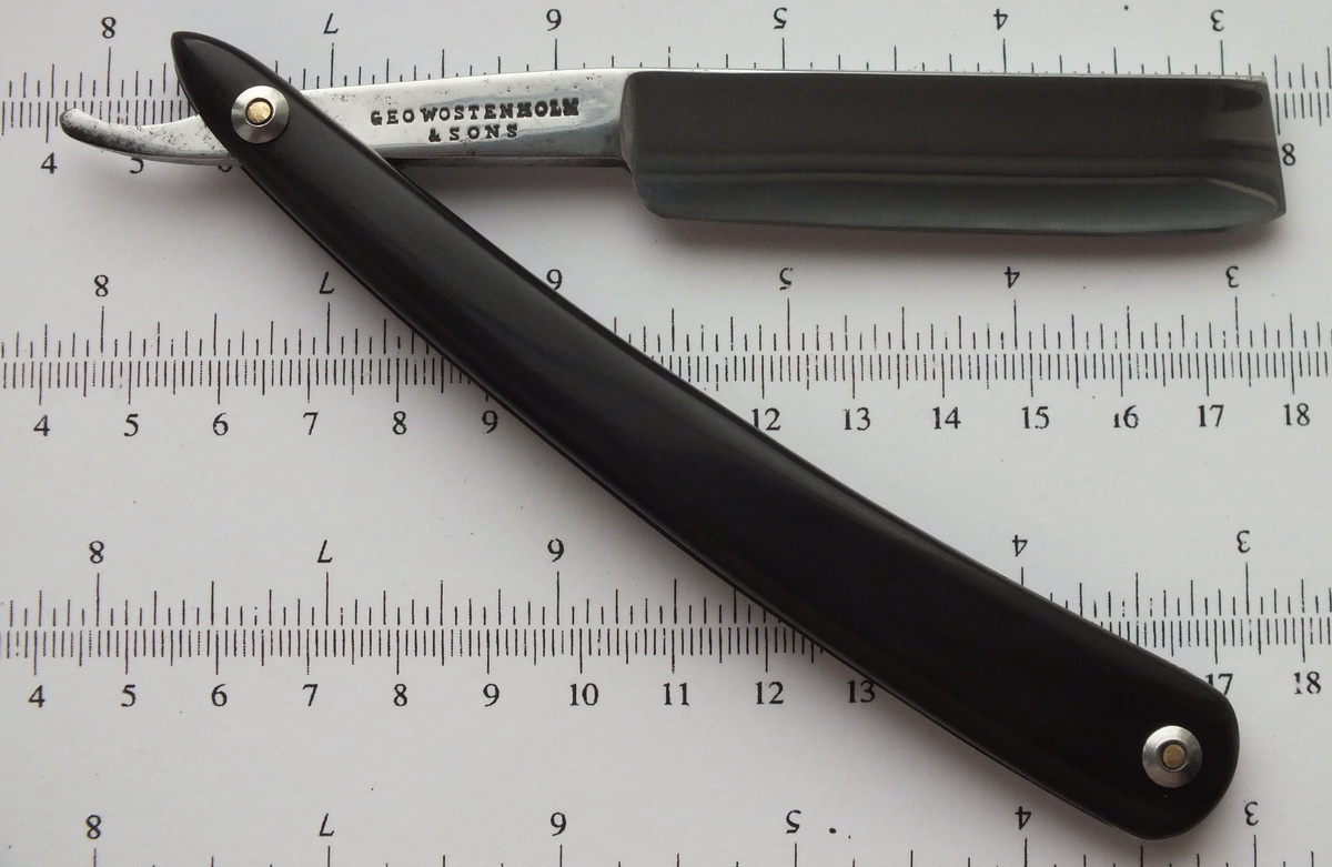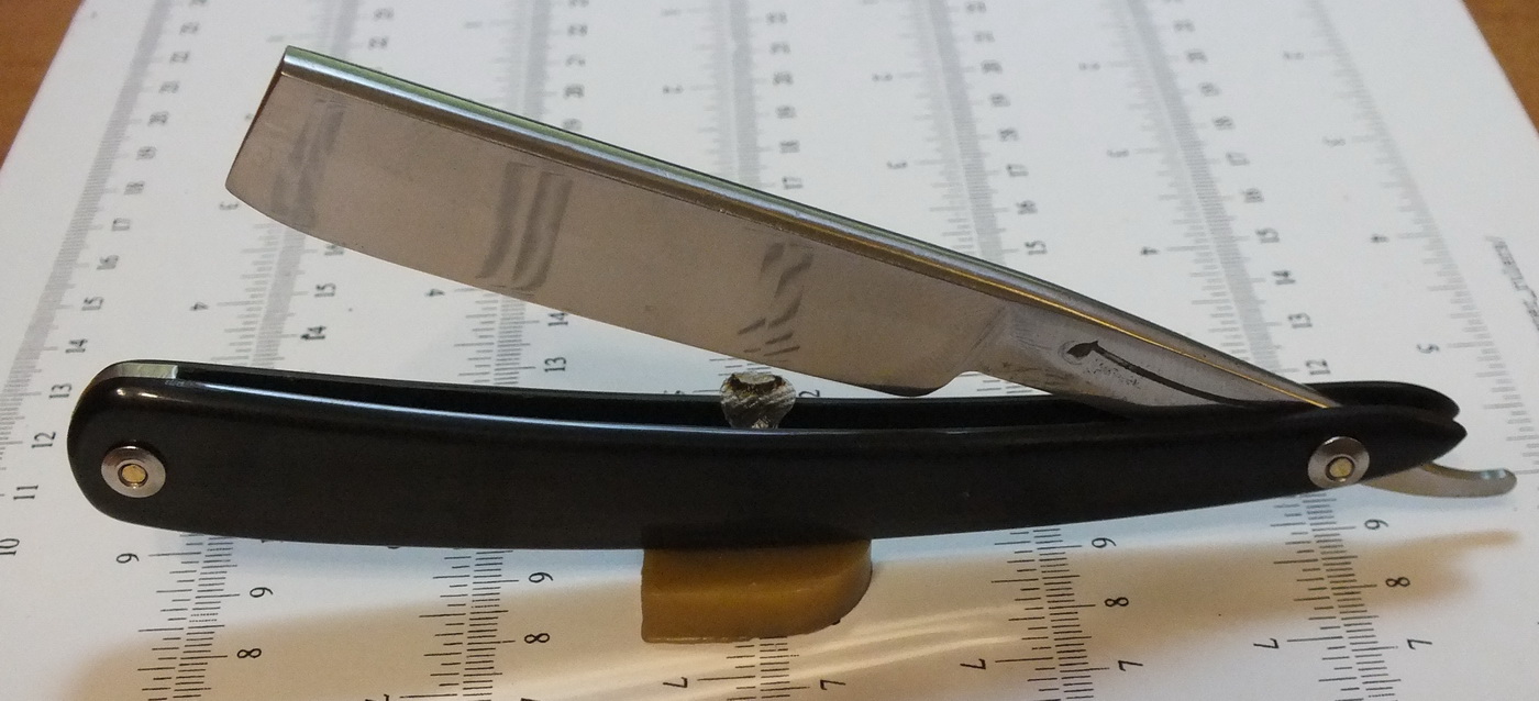 Клинок уставший. Но вполне ремонтопригоден. Оправу сделал заранее, пока бритва ехала с Украины. Рог от Boris, полосатый (черно-коричневый). Вытяжные заклепки из нержавейки М2. Клинышек ПОС-61. Вся работа занята шесть часов. Вот что вышло: 32 года активно мусолю харю клинковой бритвой
