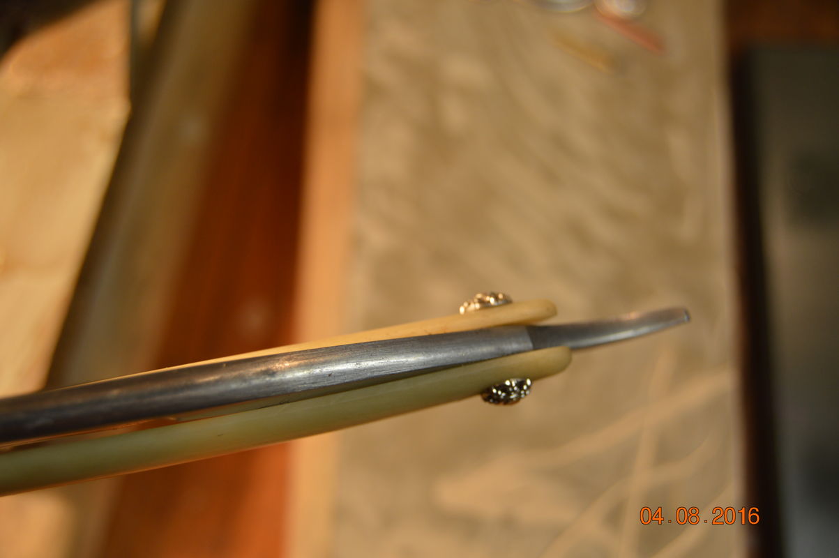 Родную роговую рукоять загнуло винтом, местами слоиться начала. Пытался ее реанимировать, не получилось, сделал новую.